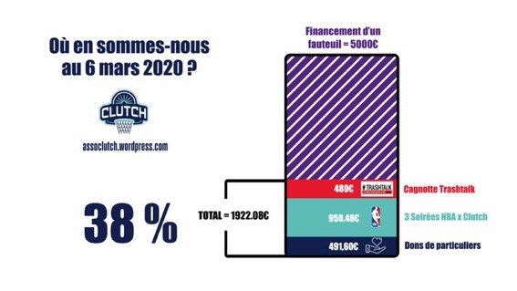Pour continuer le financement des actions sont mises en place. Lors du match NBA à Paris le 24 janvier 2020, le média Trashtalk alors en live sur youtube a versé 20 euros à chaque panier à 3 points. Résultat 480 euros de récoltés a l’issus de cette soirée. Afin de continuer à financer le projet, Clutch propose des soirées NBA le dimanche soir au 4bis à Rennes.